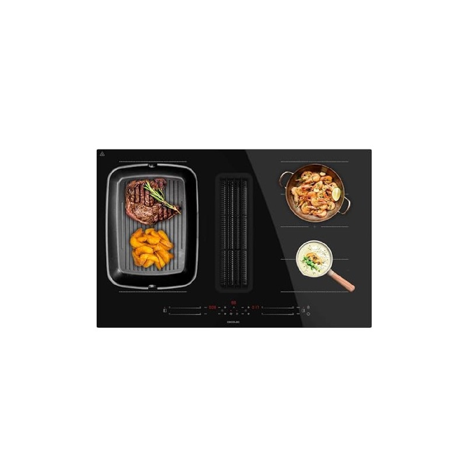 Induction hob with 2 TotalFlex zones and built-in kitchen hood, 7400 W of maximum power, 15 levels, Booster function, timer, residual heat indicator light, Kid Lock, and automatic safety shut-off. Built-in hood with suction of 630m3/H, 3 suction speeds with Booster function, automatic hood control, carbon filters, Class A and Touch Slider Control.