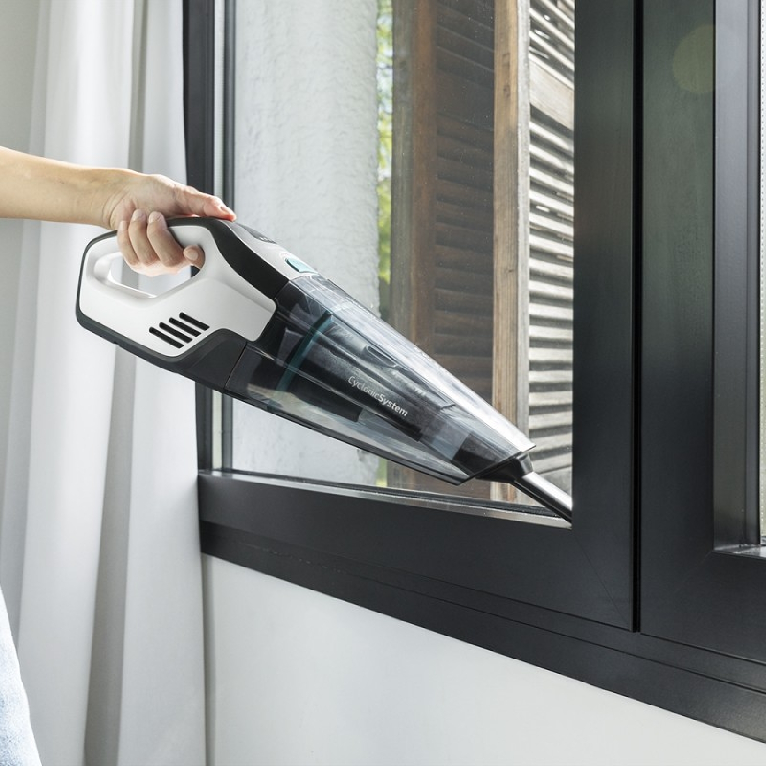 Handheld vacuum cleaner with 18.5-V Li-Ion battery. Cordless cyclonic technology. For solids and liquids. 500 ml dust container. Suitable for all surfaces. Charging base included. Includes accessory for furniture and corners.