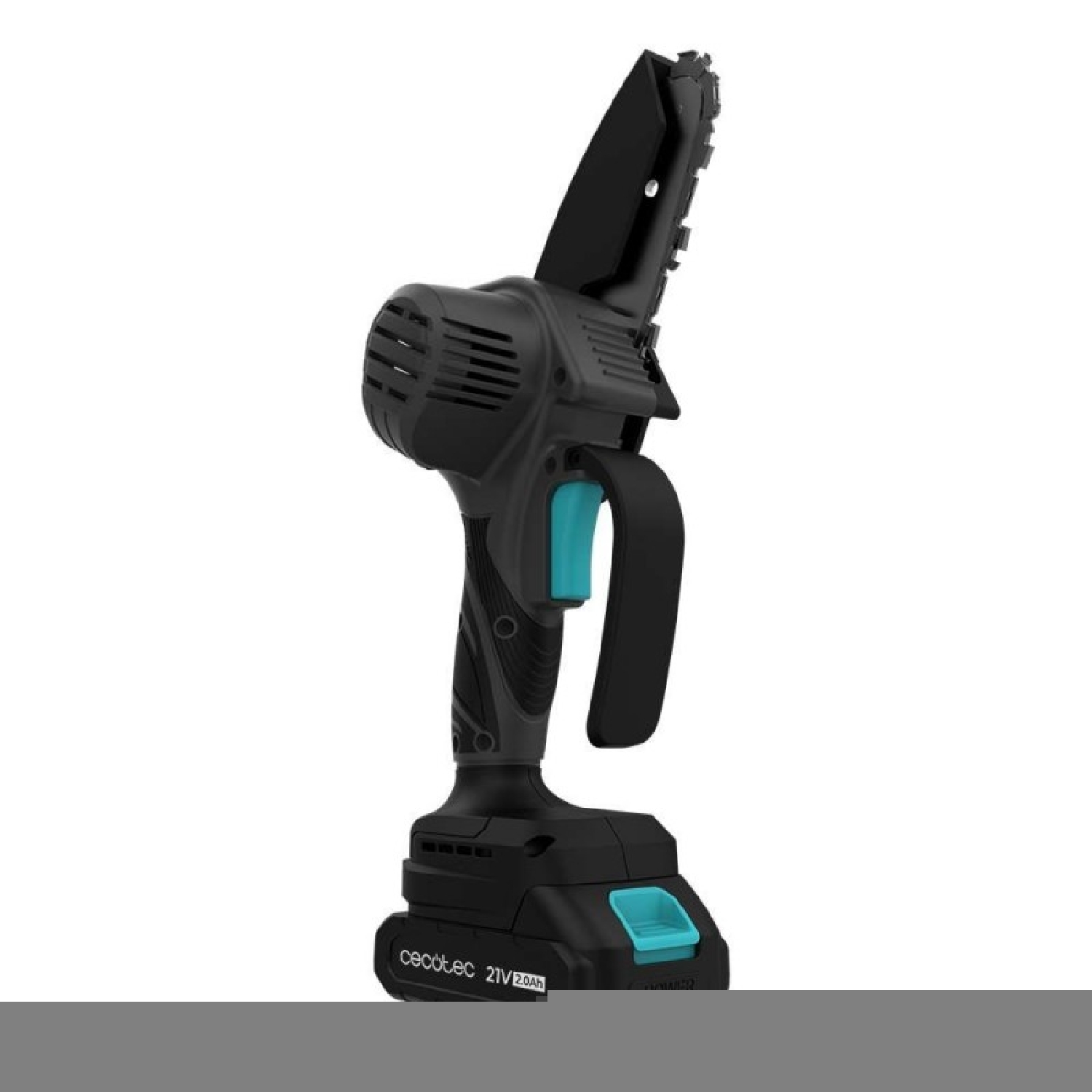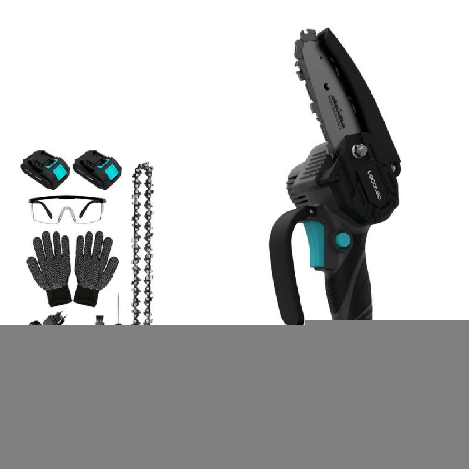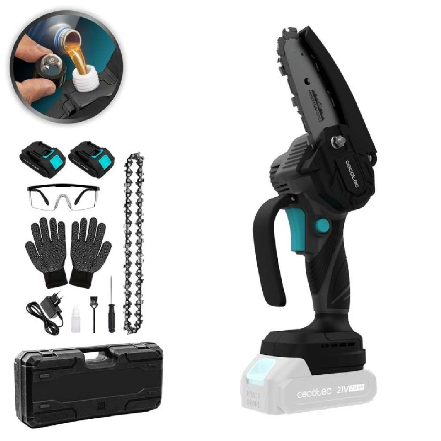 4″ pruning saw with 400 W power output. Includes two 21V batteries. Button-operated chain oiler. Includes carrying case, extra chain and accessory set.