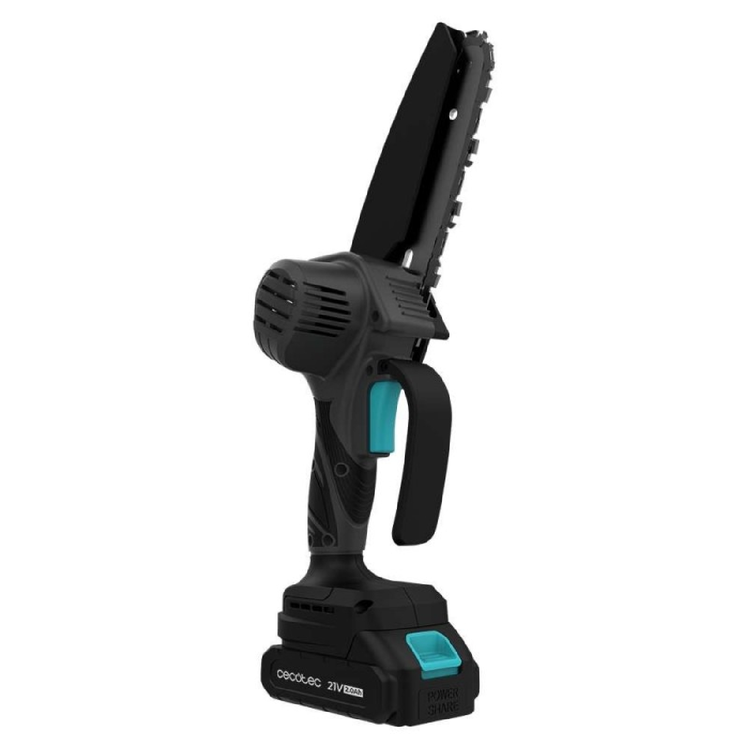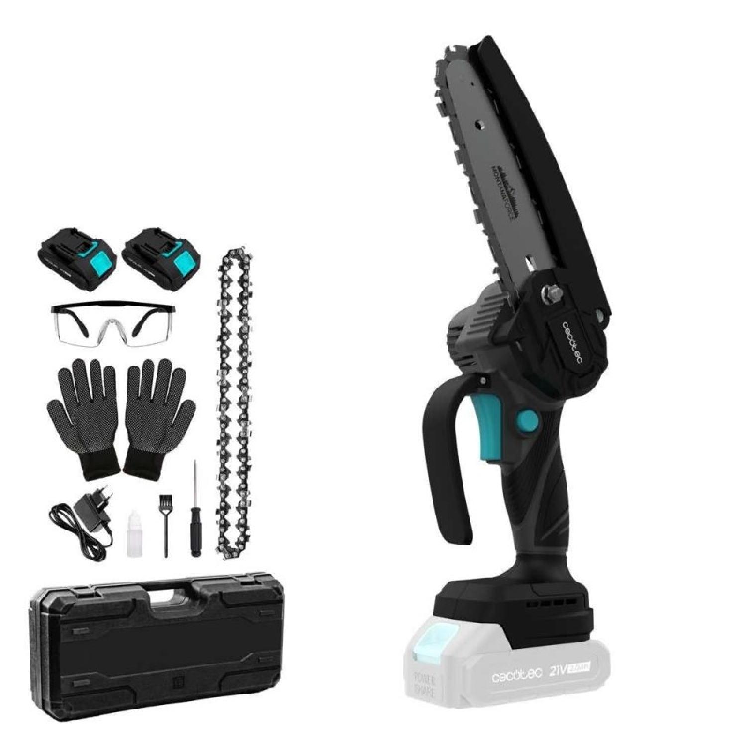6″ pruning saw. Brushless motor. 21 V battery. Button-operated chain oiler. Includes carrying case, extra chain and accessory set.