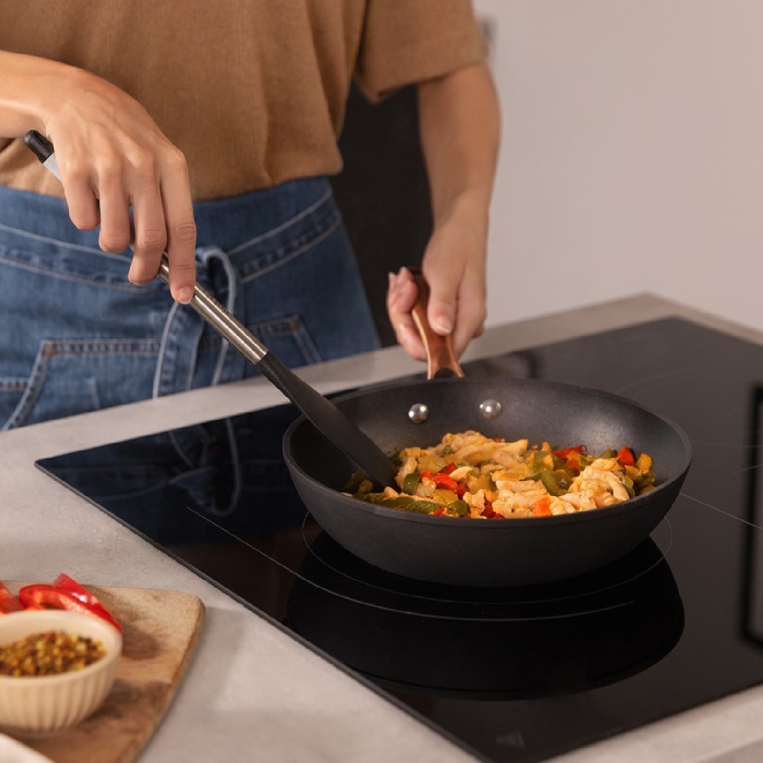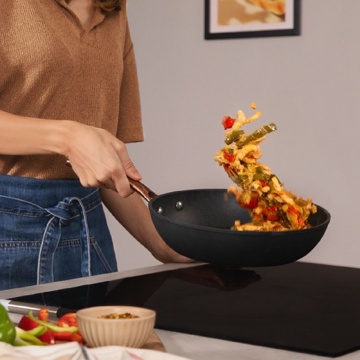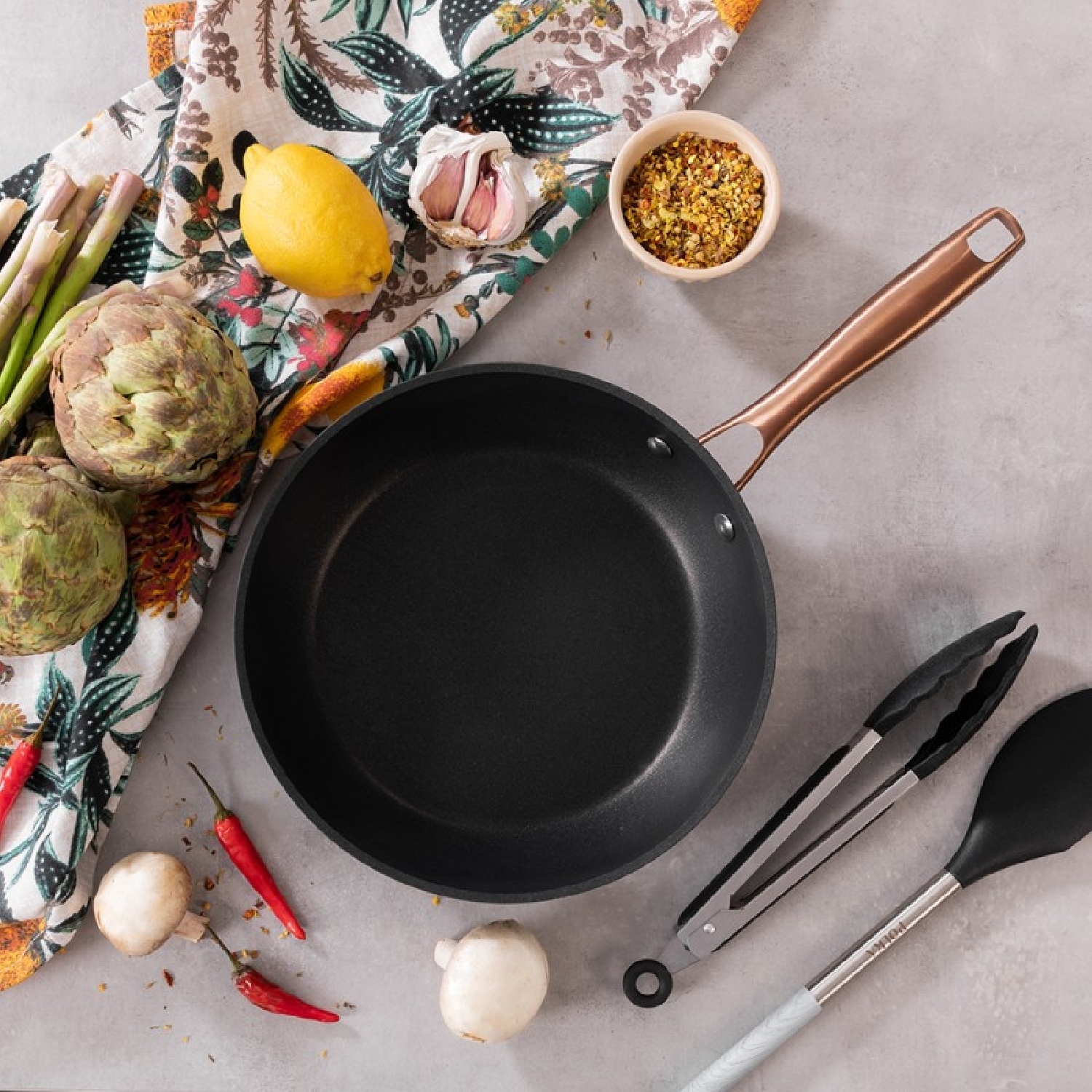 24 cm frying pan made of forged aluminium and Platinum Plus Teflon™ Nonstick Coating, 100% free from PFOA. Semi-professional, stainless-steel riveted handle in rose gold colour. Full Induction heat diffuser bottom. Oven safe up to 230 ºC, dishwasher safe and suitable for all types of cookers including induction. With 5 layers and a 3.4-mm induction base.