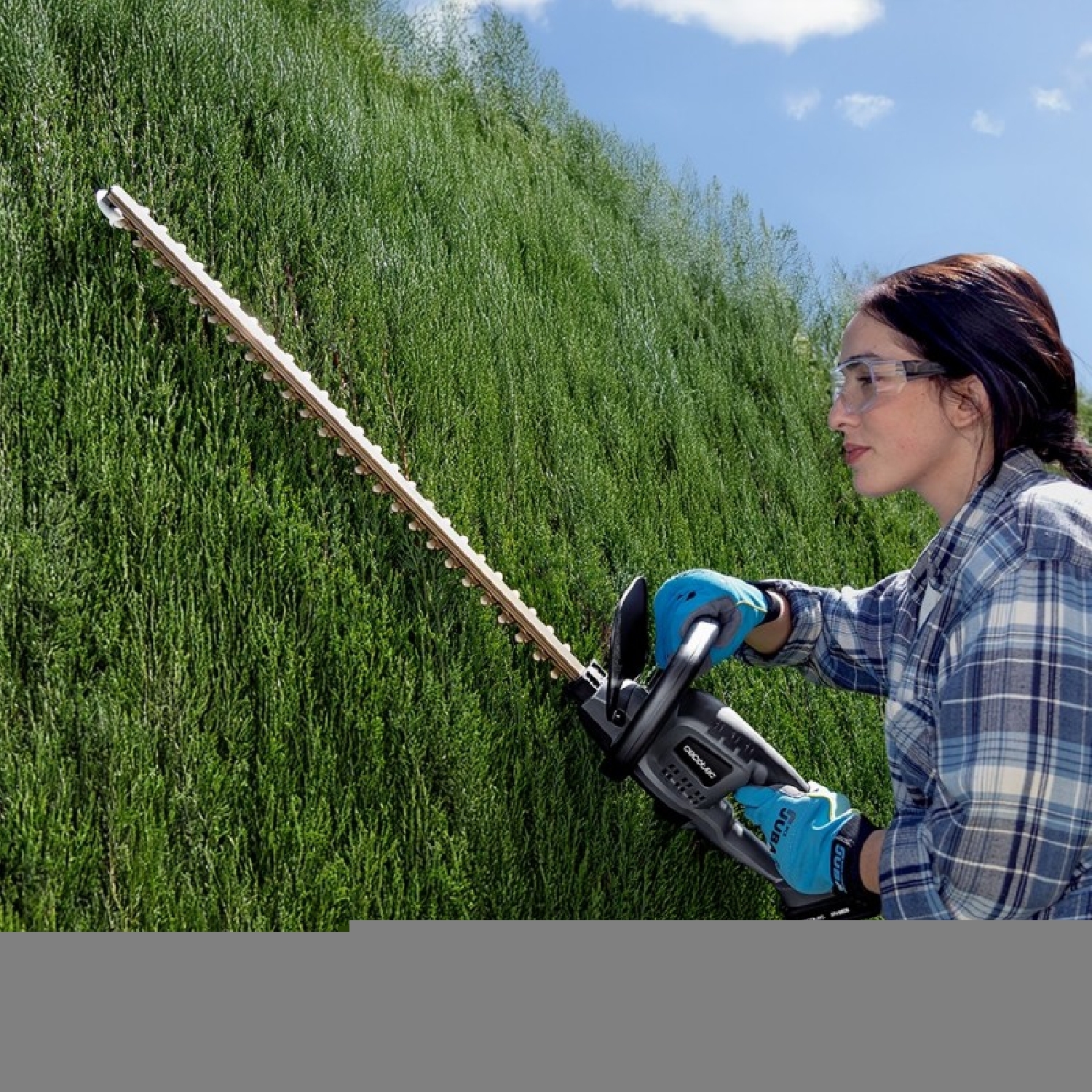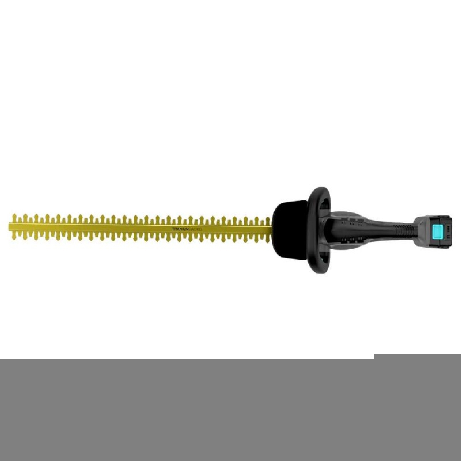 Hedge trimmer with 61 cm cutting length. 21 V battery. Brushless motor. Titanium blades. Branches up to 16 mm.